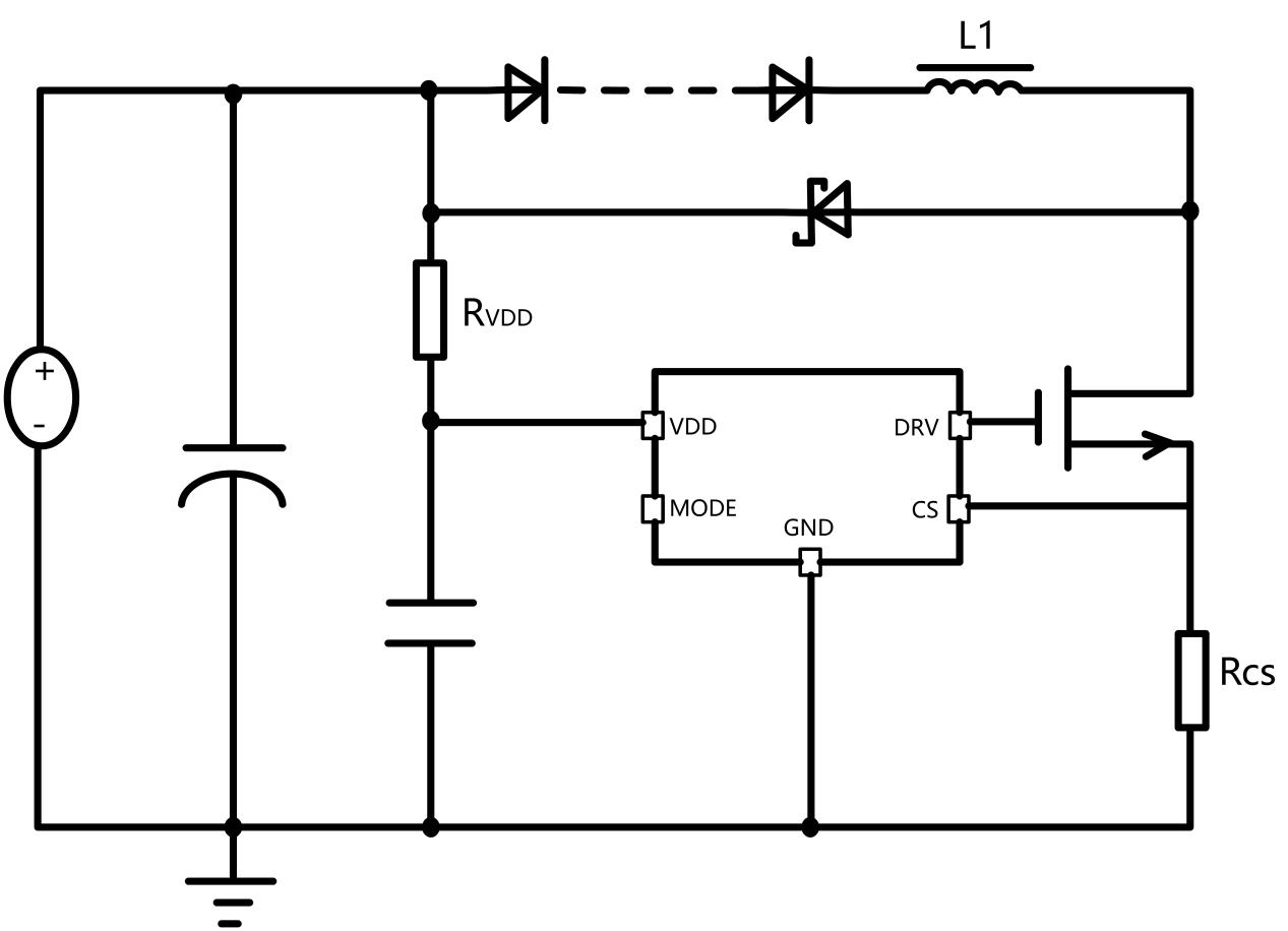其中VDD取决5.8V,IVDD典型取值2mA,VIN为输入电压。芯片内部接VDD脚的稳压管最大钳位电流不超过10mA,应注意RVDD的取值不超过这个,以免流入VDD的电流超过允许值,否则需外接稳压管钳位。