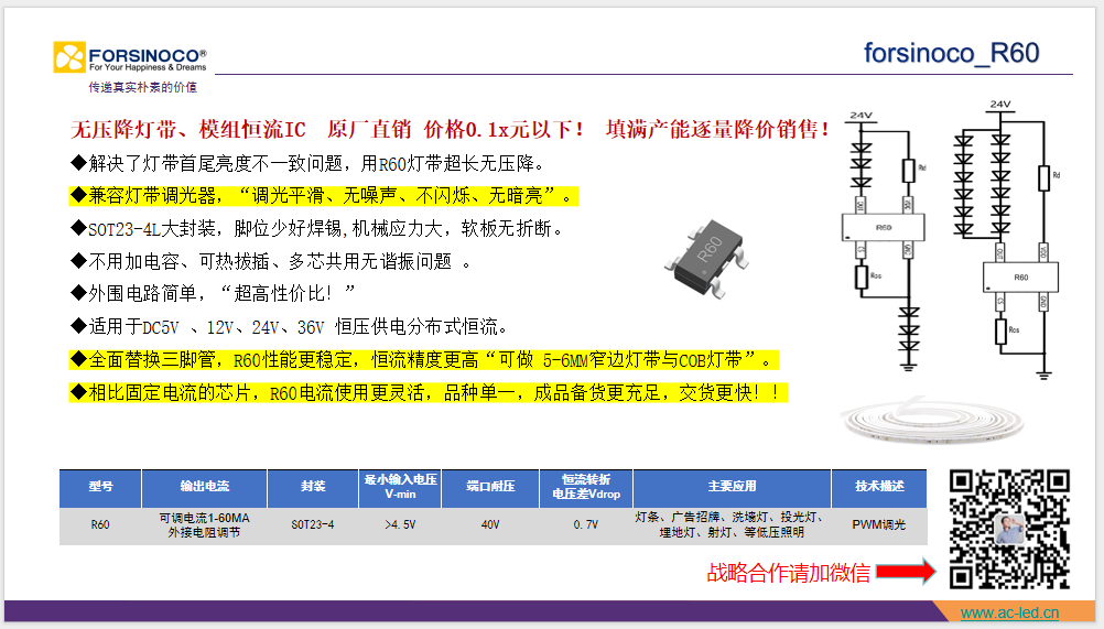 R60是一款适用于灯带、灯条和灯板等应用的中低压照明恒流驱动器,具有良好的抗冲击能力和高可靠性。LED电流由连接CS脚与GND脚的电阻RCS设定,恒流精度高,一致性好,LED电流也可以使用PWM调光控制。适用于5-30V恒压电源供电,不需要额外组件,系统结构简单,外围元件极少,方案成本低。