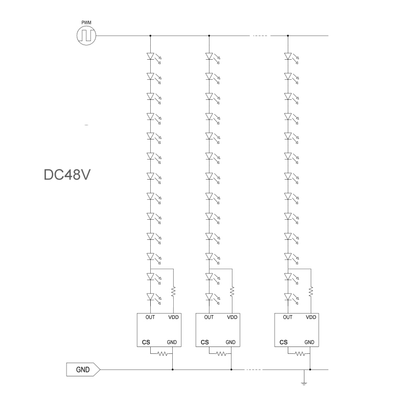 ◆耐压60V,适用于DC5V 、12V、24V、36V、48V恒压供电分布式恒流,两线调光。