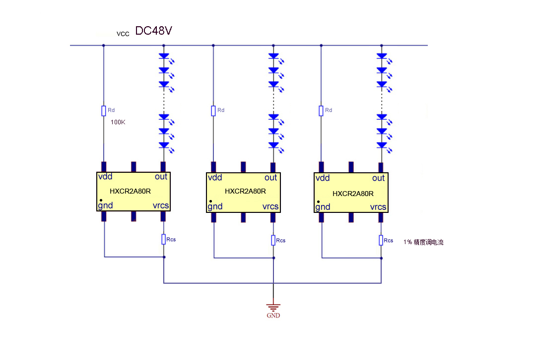 HXCR2A80R是一款内置高耐压功率器件恒流驱动器,适用于软灯带、硬灯条和照明灯板等应用的中低压照明恒流驱动器,具有良好的抗冲击能力和高可靠性。LED电流由连接CS脚与GND脚的电阻RCS设定,恒流精度高,一致性好,LED电流也可以使用PWM调光控制。适用于恒压电源供电,不需要额外组件,系统结构简单,外围元件极少,方案成本低。