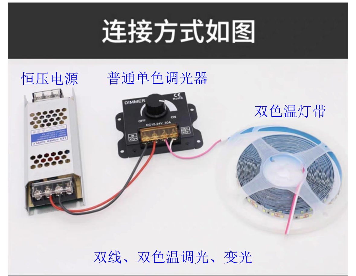 v 将PWM调光器串联接入电源,使用两种色温不同的灯珠来实现色温调节,OUT1支路使用冷白色温灯珠,OUT2支路使用暖白色温灯珠。