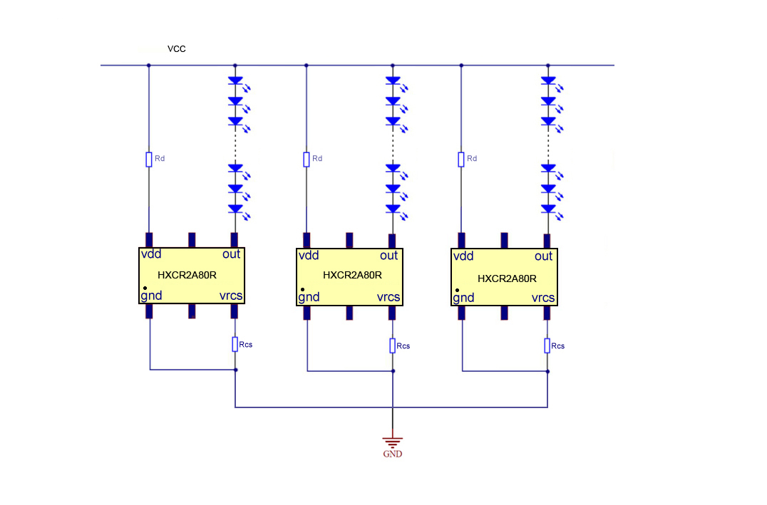 HXCR2A80R是一款内置高耐压功率器件恒流驱动器,适用于软灯带、硬灯条和照明灯板等应用的中低压照明恒流驱动器,具有良好的抗冲击能力和高可靠性。LED电流由连接CS脚与GND脚的电阻RCS设定,恒流精度高,一致性好,LED电流也可以使用PWM调光控制。适用于恒压电源供电,不需要额外组件,系统结构简单,外围元件极少,方案成本低。